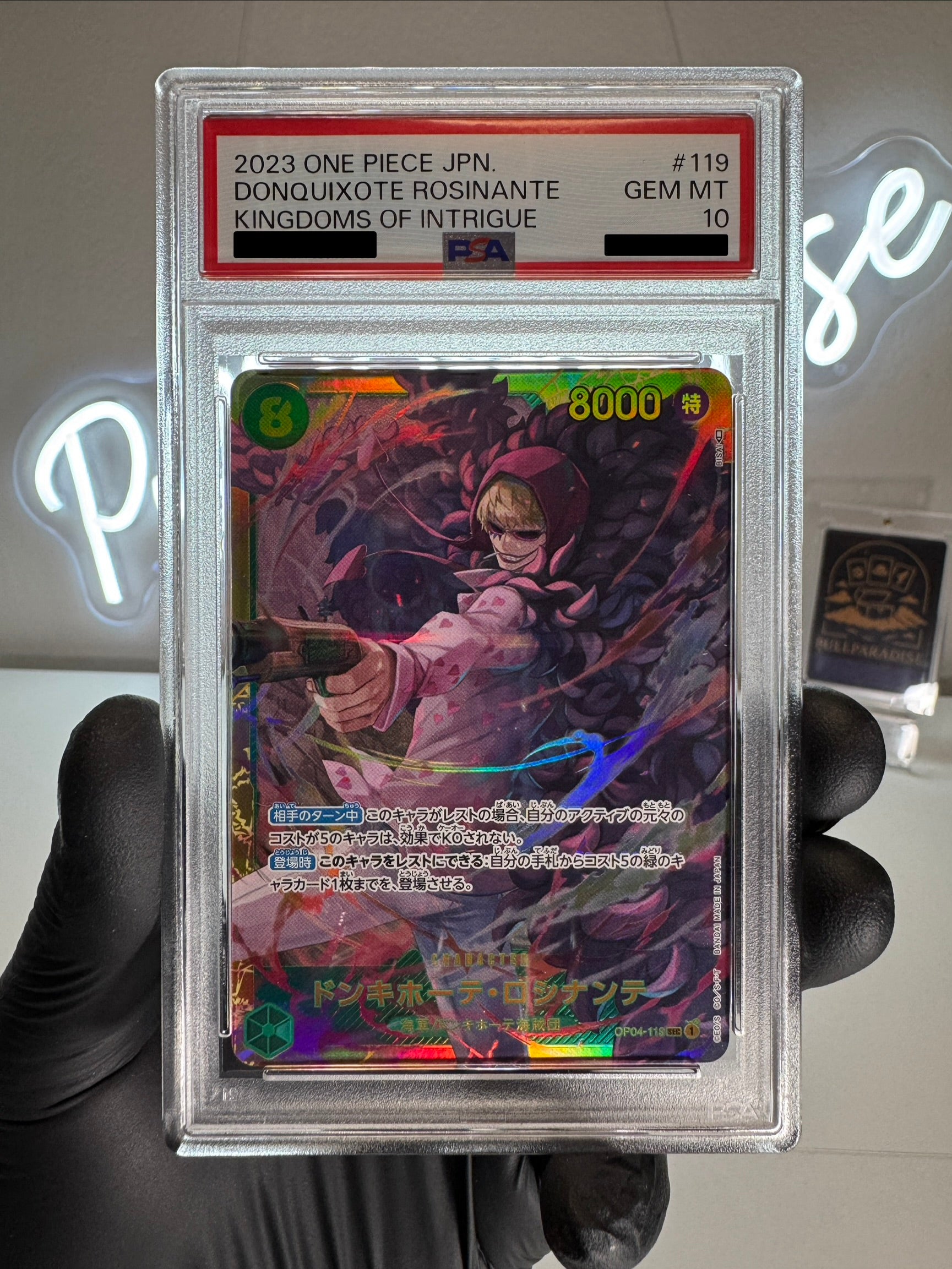 Questa carta Donquixote Rosinante – Alternate Art dal set Kingdoms of Intrigue (OP-04) è certificata PSA 10 GEM MINT, il massimo grado di qualità ottenibile.